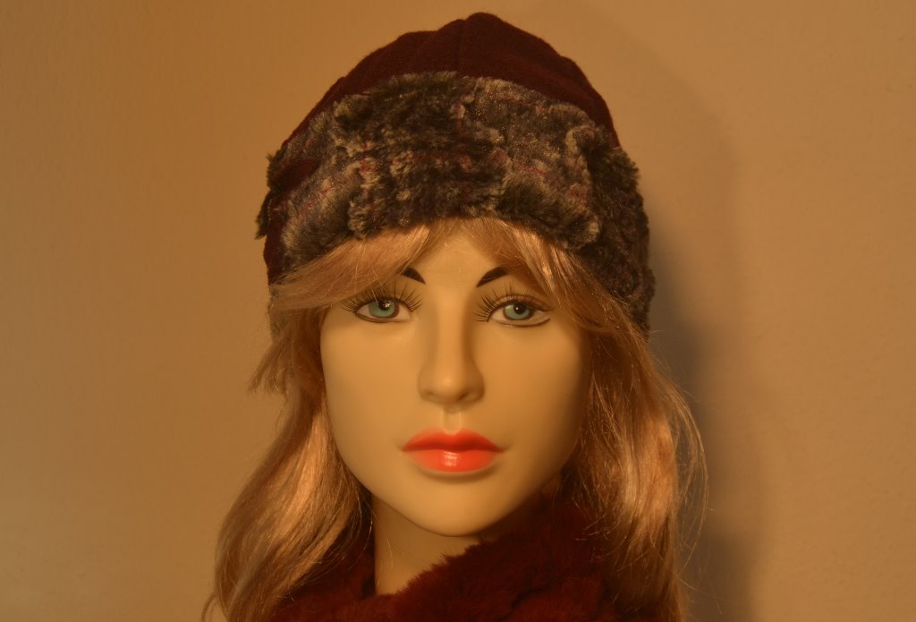 13-4005 toque laine bouillie - garni 1 bande laine bouillie et pétales - couleur noir - pétales gris taupe anthracite - 15-6016 Béret - laine bouillie - bordé fourrure - couleur : bordeaux fourrure carreaux